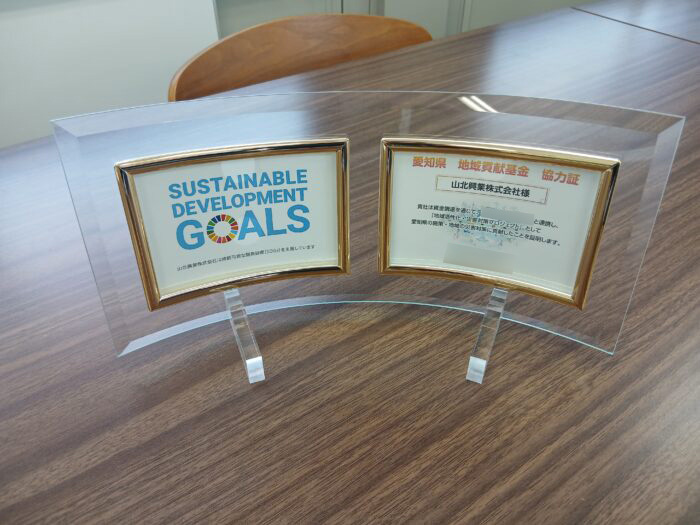 この度弊社では、銀行様より「愛知県地域貢献基金協力証(表彰楯)」をいただきました!